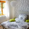Inspirace přírodou a naturálními prvky je stěžejním rysem bydlení od YIT. Březový háj nacházející se poblíž vznikající zástavby Koivu Zličín proto projektu nedal jen jméno - výraz koivu je ve finštině pojmenováním pro břízu - ale inspiroval také designérku k využití motivu finského národního stromu v rámci samotného provedení vzorového bytu. „Tradičně používáme v projektech převážně bukové a dubové dřevo. Ráz lokality však vybízel k promítnutí dekoru břízy přímo v interiéru. Do obytného prostoru, kterému dominuje bílá sedací souprava a kuchyň v bílém matu s úložnými skříňkami a jídelním stolem v dubovém dekoru, jsme proto vybrali jednoduché doplňky. Z kmene břízy byly vytvořeny odkládací stolky v obývacím pokoji a týž dekor jsme použili pro výrobu dekoračních svícnů. Ze stropu jsme dále spustili závěsné světlo v bílém odstínu, jehož stínidlo připomíná březové listí," popisuje Lenka Hlaváčková Schubertová výběr doplňků. V ložnici designérka zvolila tapetu s výraznou černobílou kresbou evokující stromořadí, která je hlavním dekorativním prvkem v místnosti, a k osvěžení prostoru tak postačily už jen polštáře a noční stolky ve vhodně zvoleném odstínu jarní zeleně. Do dětského pokoje naopak vybrala jemnou černobílou tapetu s obrysy ptáků a ptačí motiv zopakovala i na stínidle lustru. Barevnost jinak velmi světlému pokoji dodala sytě červeným kobercem s čísly umístěným před dětskou postelí s úložným prostorem.