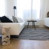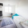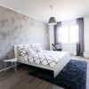Zatímco ve vzorovém bytě v Koivu Zličín byly využity především doplňky v dekoru dřeva, v Suomi Hloubětín se designérka rozhodla pro modernější provedení doplněné převážně kovovými a skleněnými elementy, které ovšem opět nezapře inspiraci současným skandinávským designem. Společný prostor obývacího pokoje a kuchyně laděný do šedobílé kombinace tak ozvláštňují černé dekorativní prvky v kovovém provedení, ať už se jedná o výrazné konferenční stolky či závěsné svítidlo značky WIRO od Wever & Ducré připomínající jemnou pavučinu. Ložnici pak vévodí dekorativní malba v šedém odstínu s výraznou kresbou, která je natažená na stěně za bílou manželskou postelí s nočními stolky ve stejné barvě. U okna, které z obou stran rámují spuštěné tmavě šedé závěsy, se vyjímá černé kovové křeslo s koženým potahem. Odstín závěsů ladí i s výrazným kobercem uprostřed místnosti. Dětský pokoj je pak pojat v barevnějším a veselejším duchu. Kromě nábytku v kombinaci bílé barvy a přírodního dřeva je jeho součástí i tyrkysový sedací vak a ze stropu je zavěšené světlo s motivem abecedy, jenž se opakuje také na úzkém pruhu tapety na stěně za postelí.