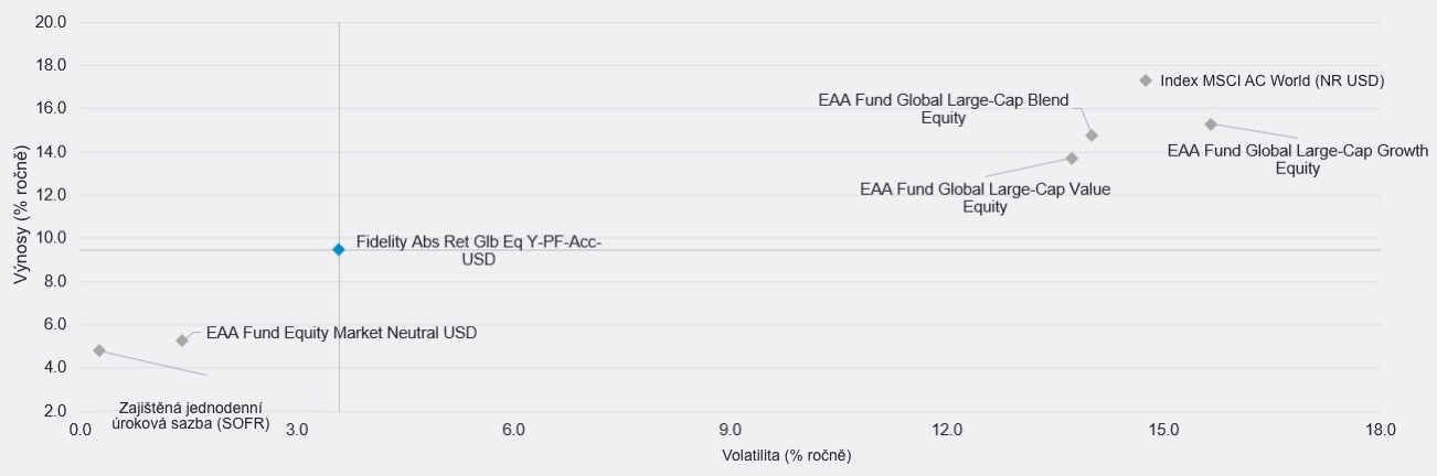 Díky těmto charakteristikám dokázal fond ARGE v uplynulých třech letech dosáhnout podobného výnosu jako globální akcie, avšak s výrazně nižší volatilitou (graf 4). Fond tak byl schopen přinést významné výhody diverzifikace vyváženým portfoliím v období, kdy se tradiční diverzifikační techniky (např. skladba portfolia v poměru 60/40) ukázaly jako nedostatečné.