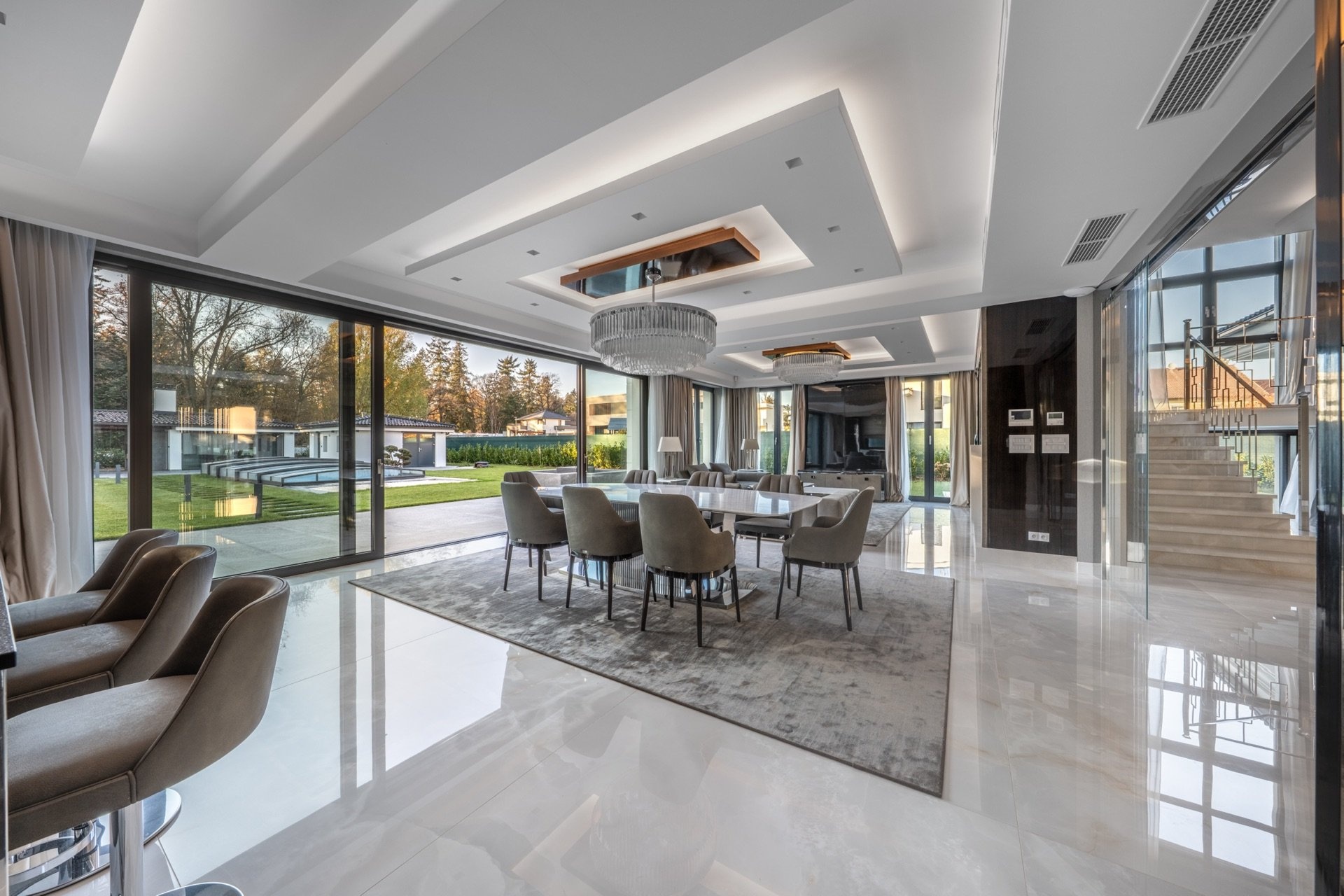 Princip „útěku ke kvalitě“ je patrný i v Praze a okolí, kde zůstávají nejžádanější nemovitosti v prestižních městských částech s dostatkem soukromí a zeleně. V lukrativní lokalitě Průhonice představuje typický příklad luxusní vila Lumière, která spojuje moderní architekturu, nadstandardní technologie a bezprostřední blízkost přírody s rychlou dostupností do metropole. Nemovitost o celkové užitné ploše 590 m² s pozemkem 2 287 m² zahrnuje mj. privátní wellness zónu s vyhřívaným bazénem, finskou saunou, letní kuchyní a odpočinkovou místností s krbem.