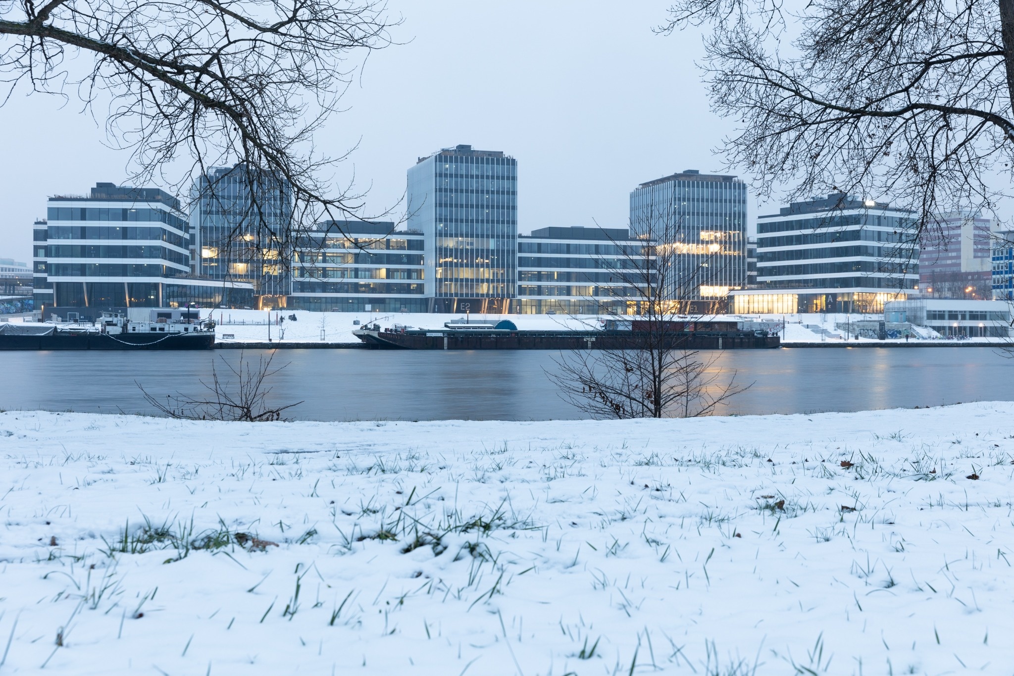 In addition to top-quality offices, Port7 also offers a wide range of services and leisure activities. The ground floor of the buildings houses a café, restaurant, pharmacy, eye clinic, fitness center, and coworking spaces. The surrounding public space includes a park, community garden, playgrounds and sports facilities. The riverside offers a climbing wall and a barbecue area.