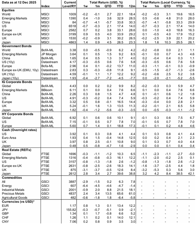 Je nutné vše vnímat v kontextu převládajícího sentimentu na začátku roku (například optimismus ohledně amerických akcií a dolaru v souvislosti s „Trumpovým obchodem“). Zdá se, že rok 2025 bude pro Aristotelův seznam smíšeným rokem. Připomíná mi to slova Rudyarda Kiplinga: „Pokud dokážeš čelit úspěchu i neúspěchu a brát je oba jako podvodníky, pak jsi vyrovnaný člověk...“, což je dobré si pamatovat v dobrých i špatných časech. Výběr pro rok 2026 zveřejním na začátku ledna. V posledních týdnech a měsících jsem se setkal s mnoha investory, což mi pomáhá posoudit převládající náladu. Nadále věřím, že hlavním motorem výnosů budou ekonomické a politické cykly. Očekávám, že globální ekonomika zrychlí díky nedávnému i budoucímu uvolnění měnové politiky centrálních bank (a určitým fiskálním impulsům). Vede mě to k relativnímu optimismu ohledně výnosů z různých aktiv v roce 2026 (i když rok 2025 bude těžké překonat). Domnívám se, že hlavní otázky, které investoři řeší, jsou, zda dojde ke změně vedoucí pozice na akciovém trhu (výkonnost Velké 7 byla již v roce 2025 smíšená) a zda drahé kovy mohou zopakovat vynikající výkonnost z roku 2025 (jsem skeptický). Pokud není uvedeno jinak, všechna data jsou k 12. prosinci 2025.