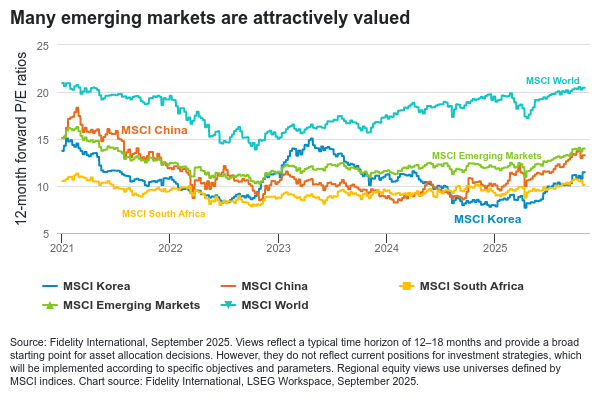 Akcie v zemích jako Jižní Korea a Jižní Afrika se přehodnocují směrem nahoru, a to díky zlepšujícím se základním ukazatelům a atraktivním oceněním ve srovnání se zbytkem světa. Čína vypadá pro rok 2026 slibně, protože její pokračující politická podpora vytváří konkrétní příležitosti.