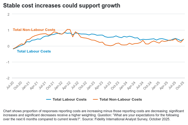 Thomas Goldthorpe, analytik akcií se zaměřením na finanční tituly ve společnosti Fidelity International, poukazuje na „nižší sazby a politiku federální vlády vstřícnější vůči podnikání“, které budou podporovat společnosti po celý rok 2026. Analytici Fideilty International také předpokládají, že v příštích šesti měsících dojde ke stabilnímu růstu nákladů v jimi pokrývaných společnostech, což by mohlo podpořit růst celkově.